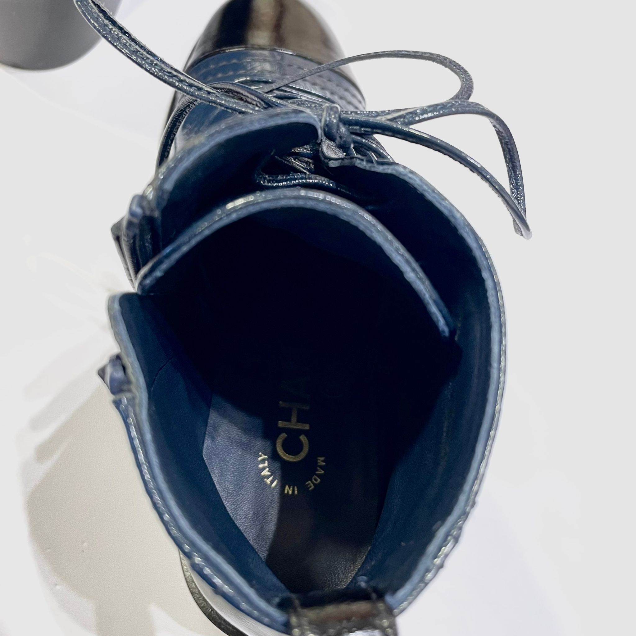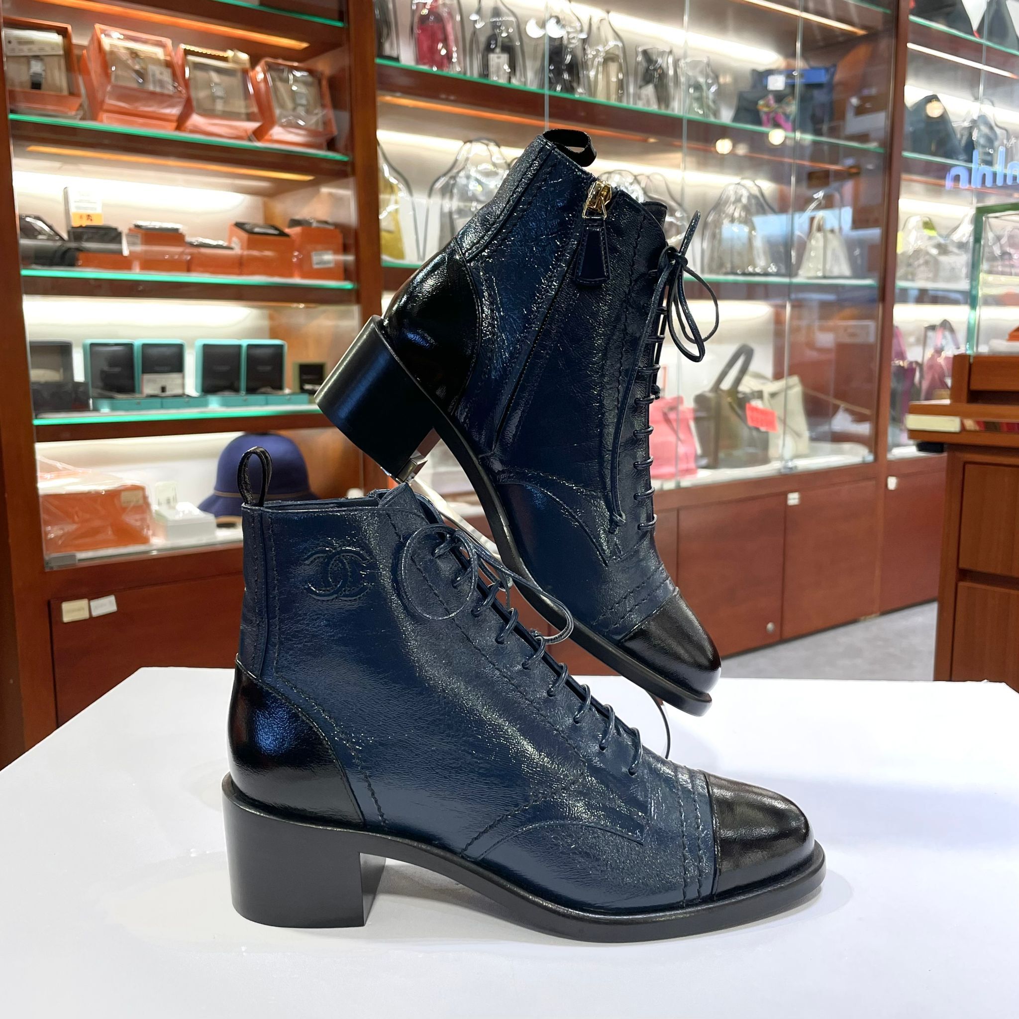 本月大特價!!! 全新CHANEL短靴 36.5碼, G34643, 深藍色/黑色 亮面牛皮系帶靴子,香奈兒ANKLE BOOTS #BRAND NEW #香榭站正品