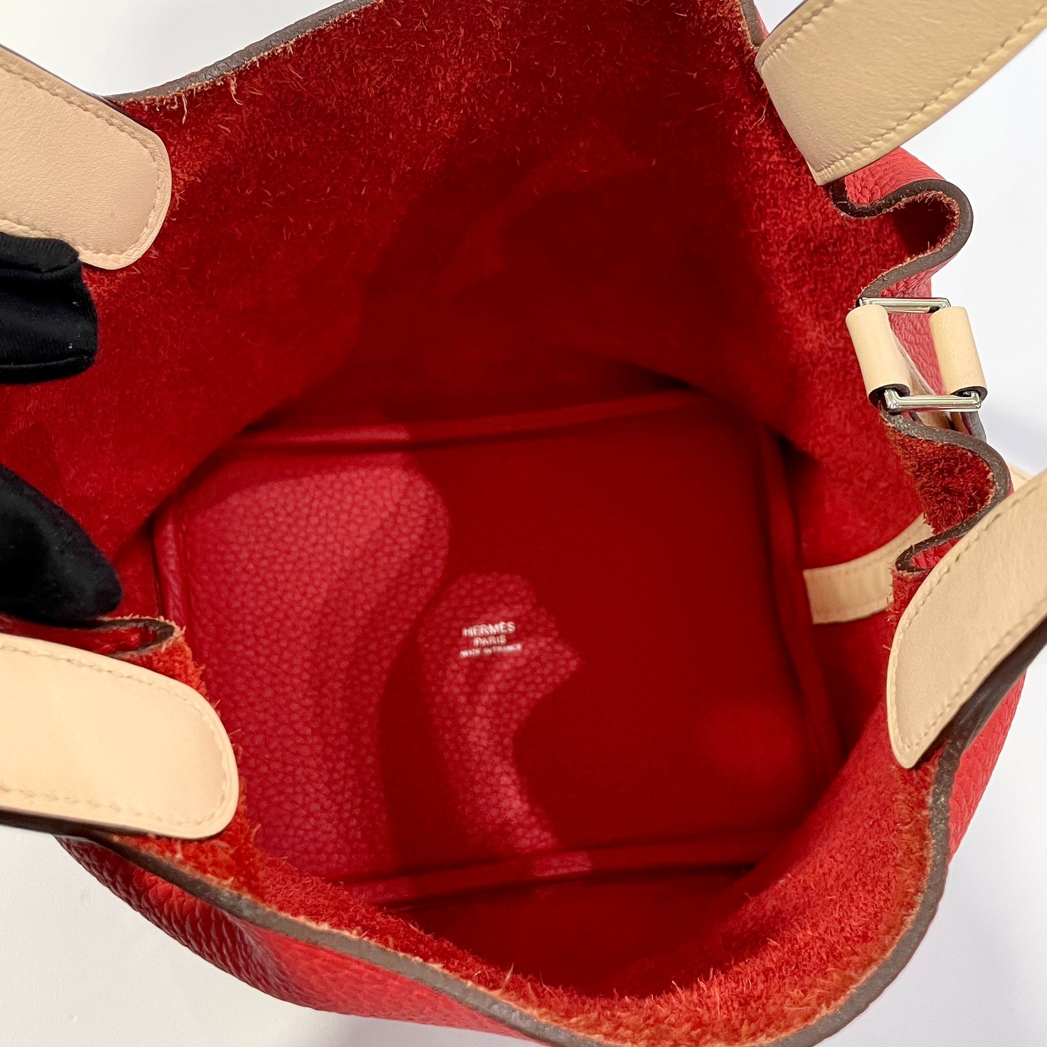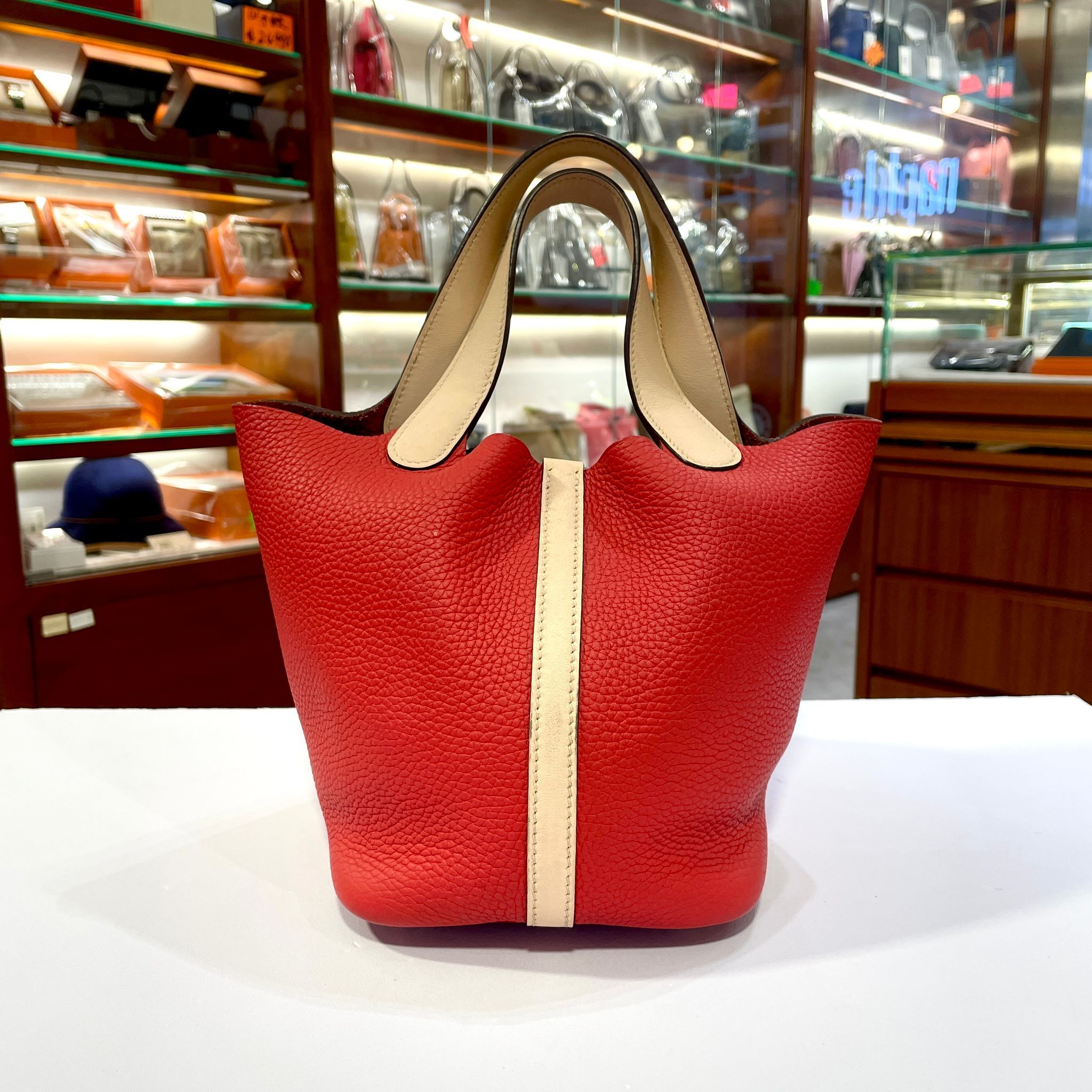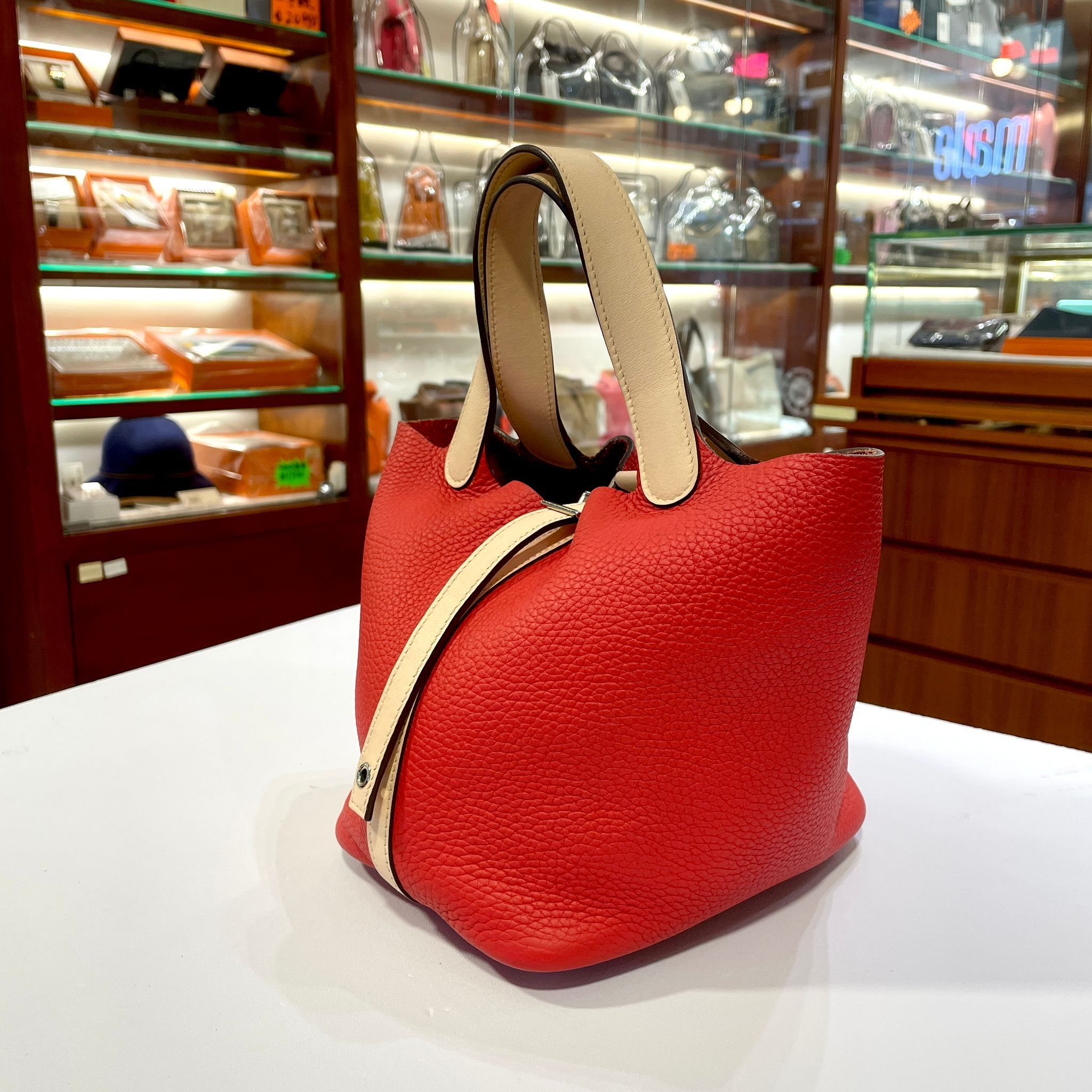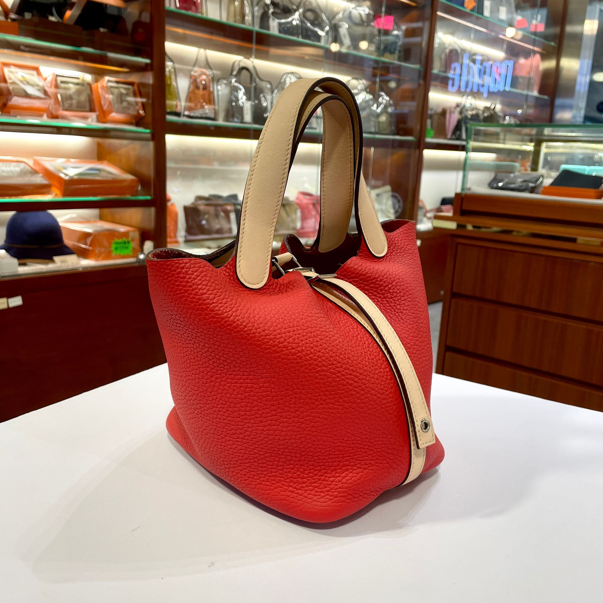 98%NEW二手HERMES PICOTIN 18 番茄紅拼薔薇粉 銀扣 TOUGE TOMATE PHW #P18#香榭站正品