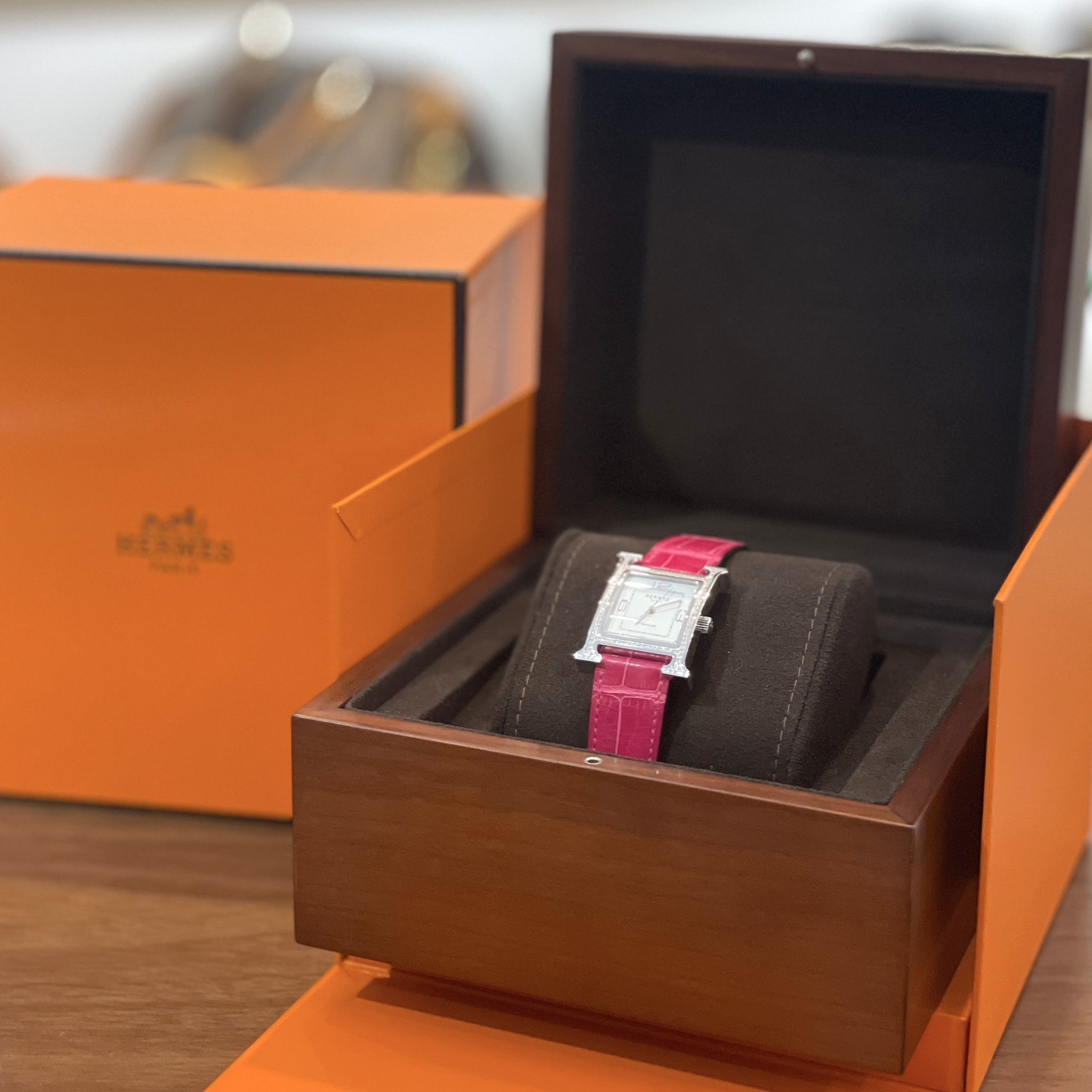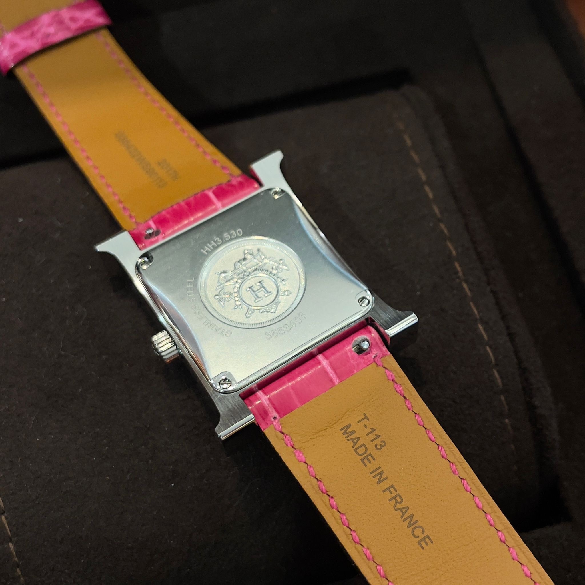 全新 HERMES 手錶 26mm 黑/桃紅色鱷魚皮錶帶/鑽石銀扣 Heure H watch #BRAND NEW #香榭站正品