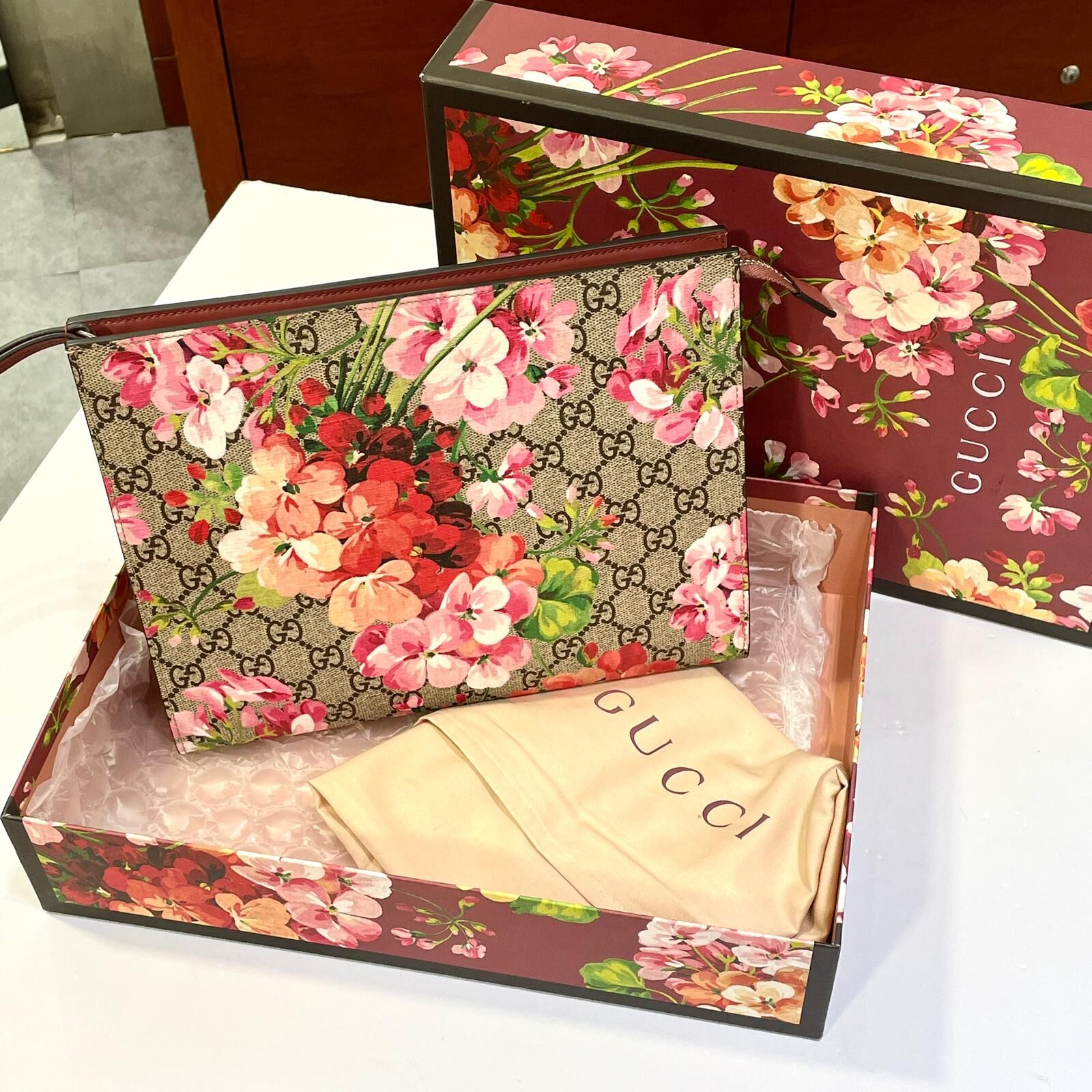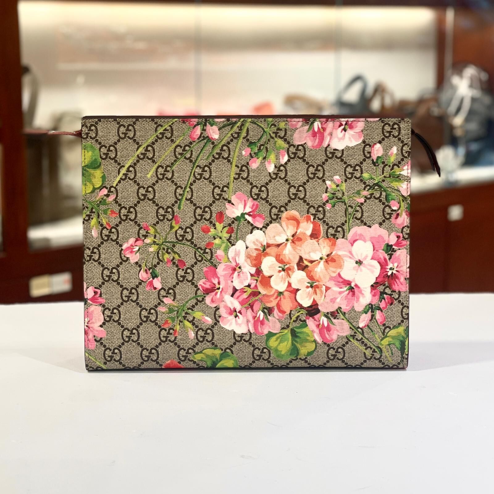 全新GUCCI手拿包 天竺葵花卉印花,GG SUPREME BLOOM POUCH #洗漱包 #化妝包 #BRAND NEW #香榭站正品