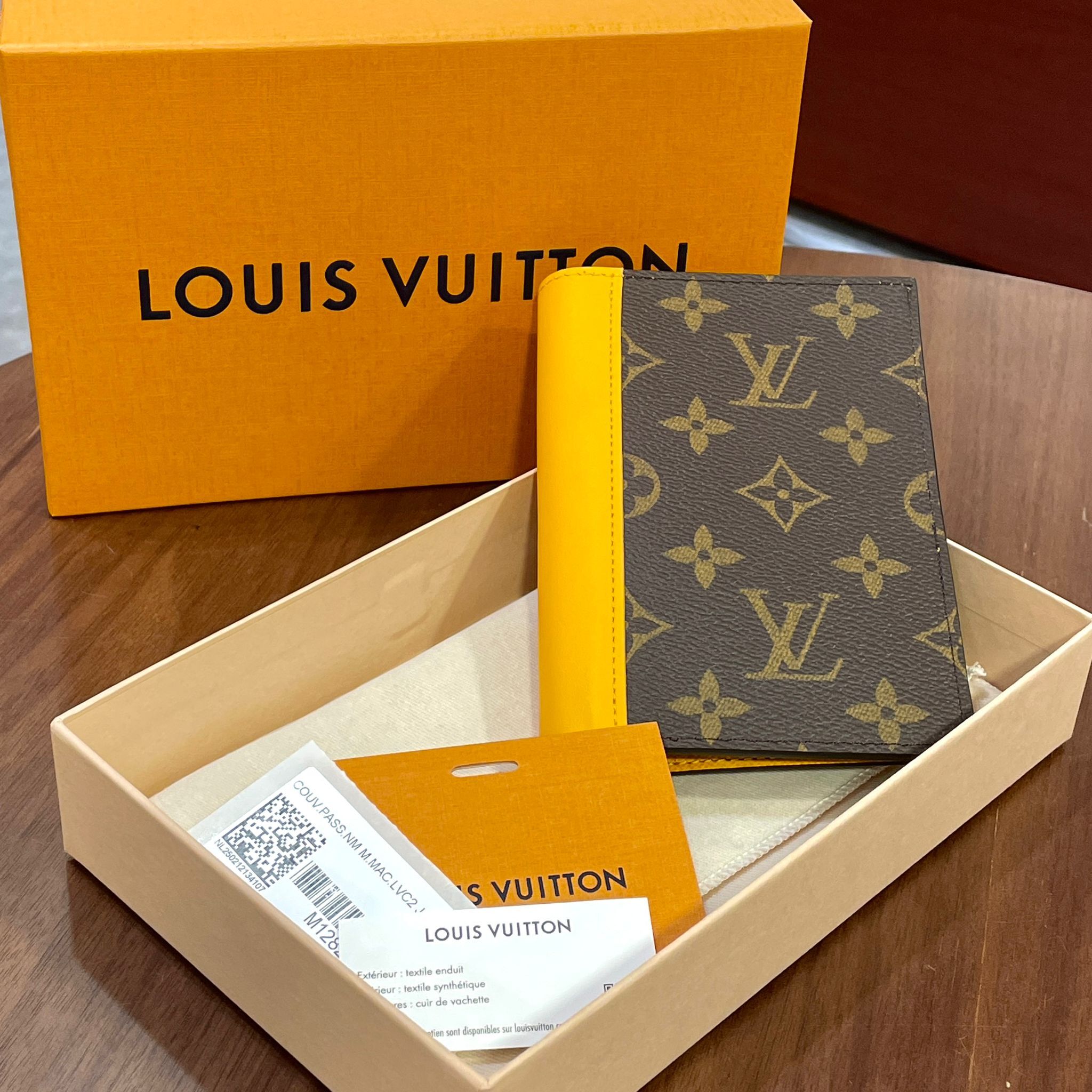 全新LV護照套/銀包 M12827 SAFRAN黃色牛皮飾邊/啡色MONOGRAM塗層帆布 #BRAND NEW #香榭站正品