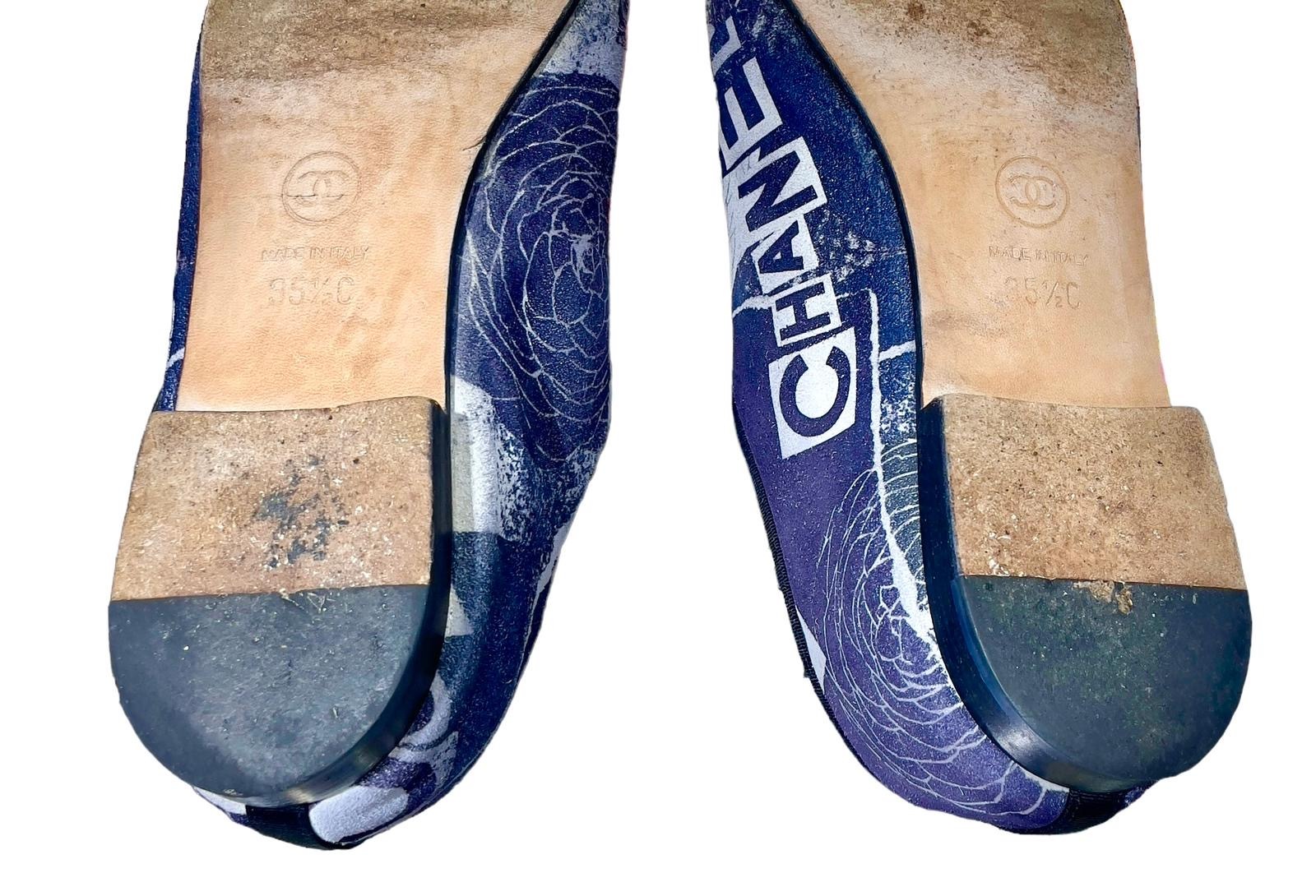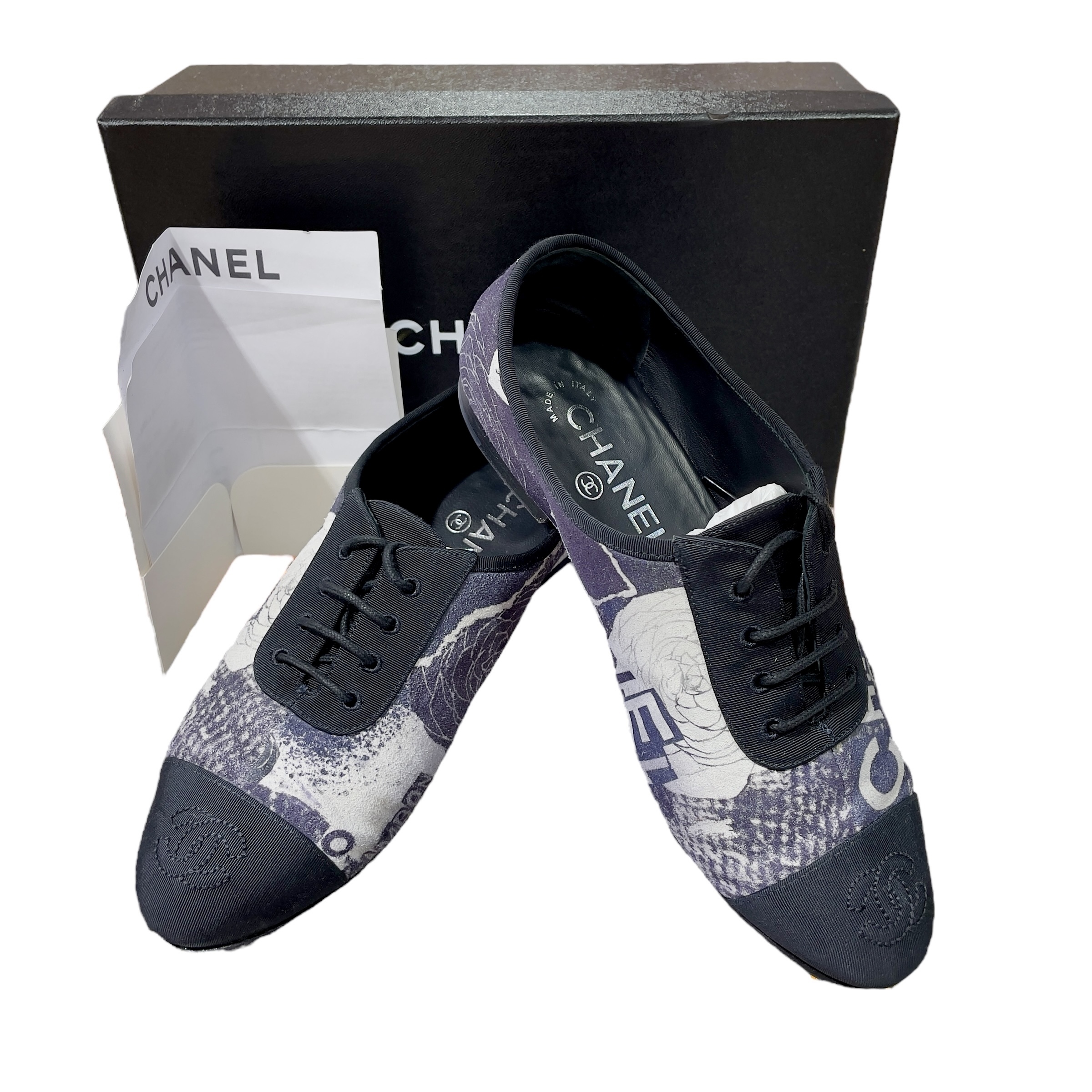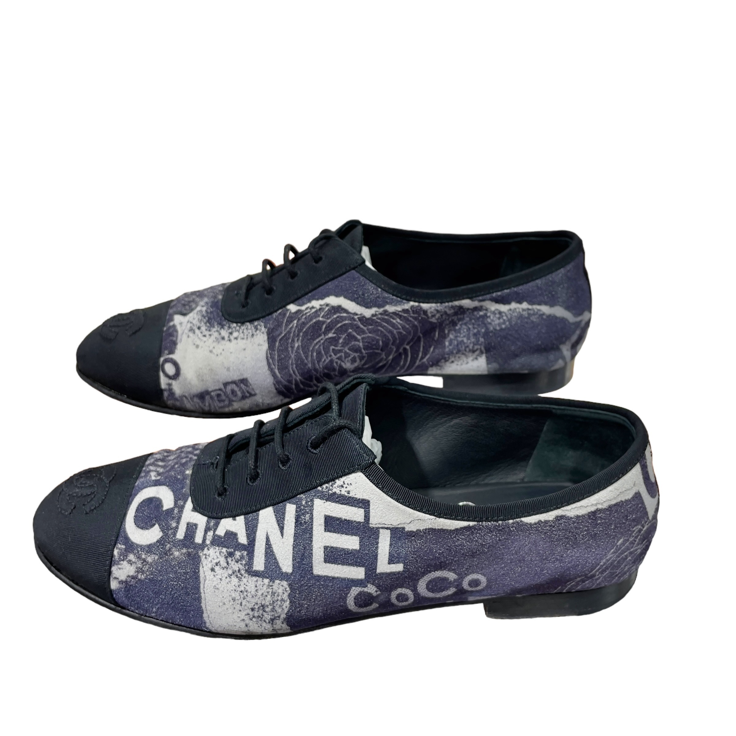 85%NEW二手CHANEL平底鞋35.5碼 黑色/灰白字母印花小牛皮 #香榭站正品