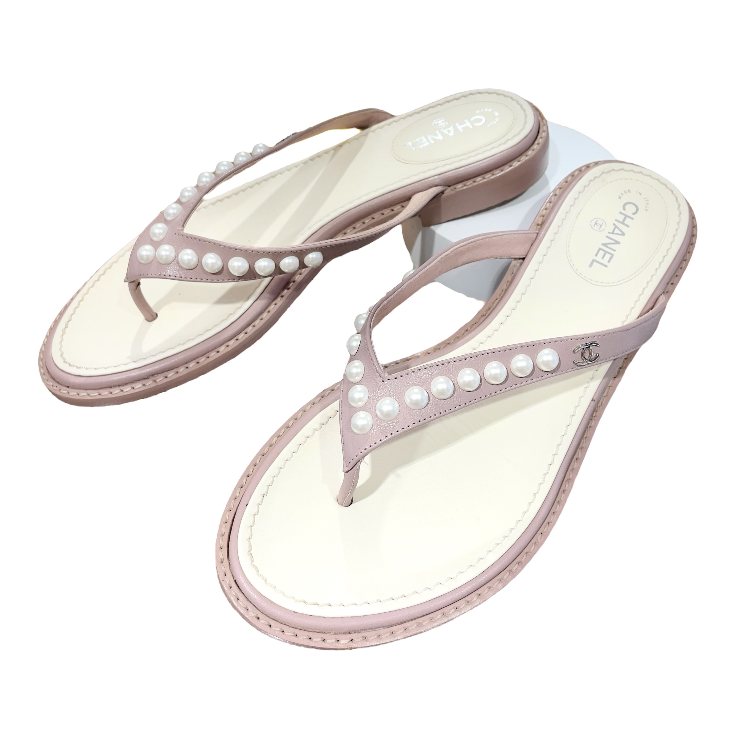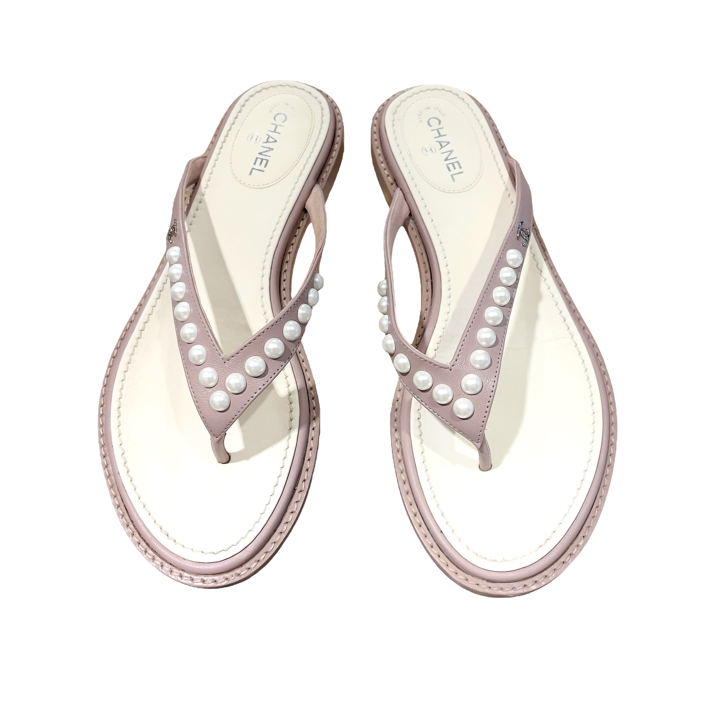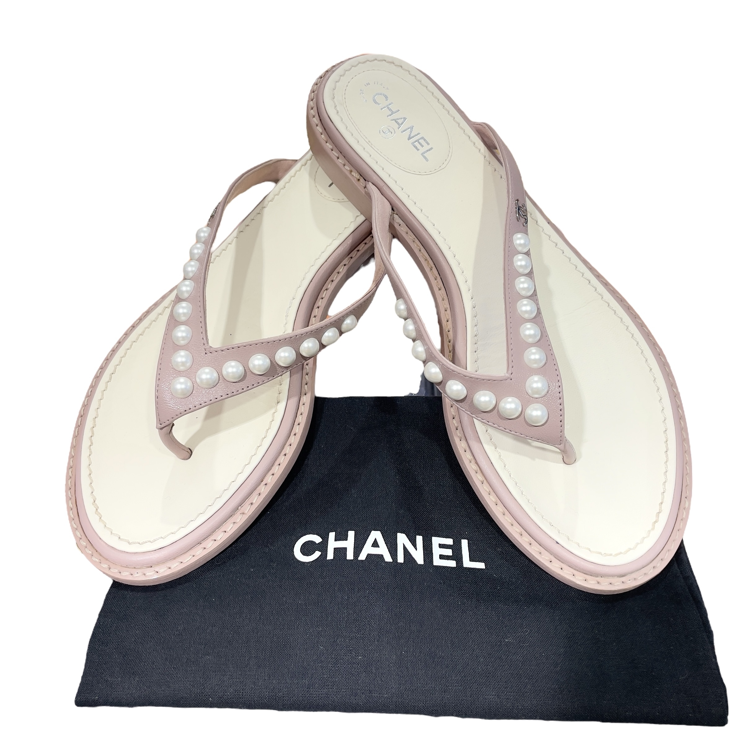95%NEW 二手 CHANEL 人字拖鞋, 37碼 ,粉色羊皮, 綴珍珠, #香榭站正品
